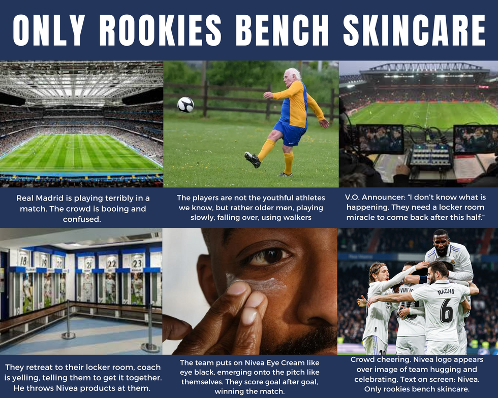 For the Nivea Men x Real Madrid campaign, I wanted to keep it simple and relatable—because no matter who you are or what you do, no one wants premature wrinkles. I don’t know much about men’s skincare routines or soccer, but I do know that humor works, and only rookies bench skincare became the heart of the concept.